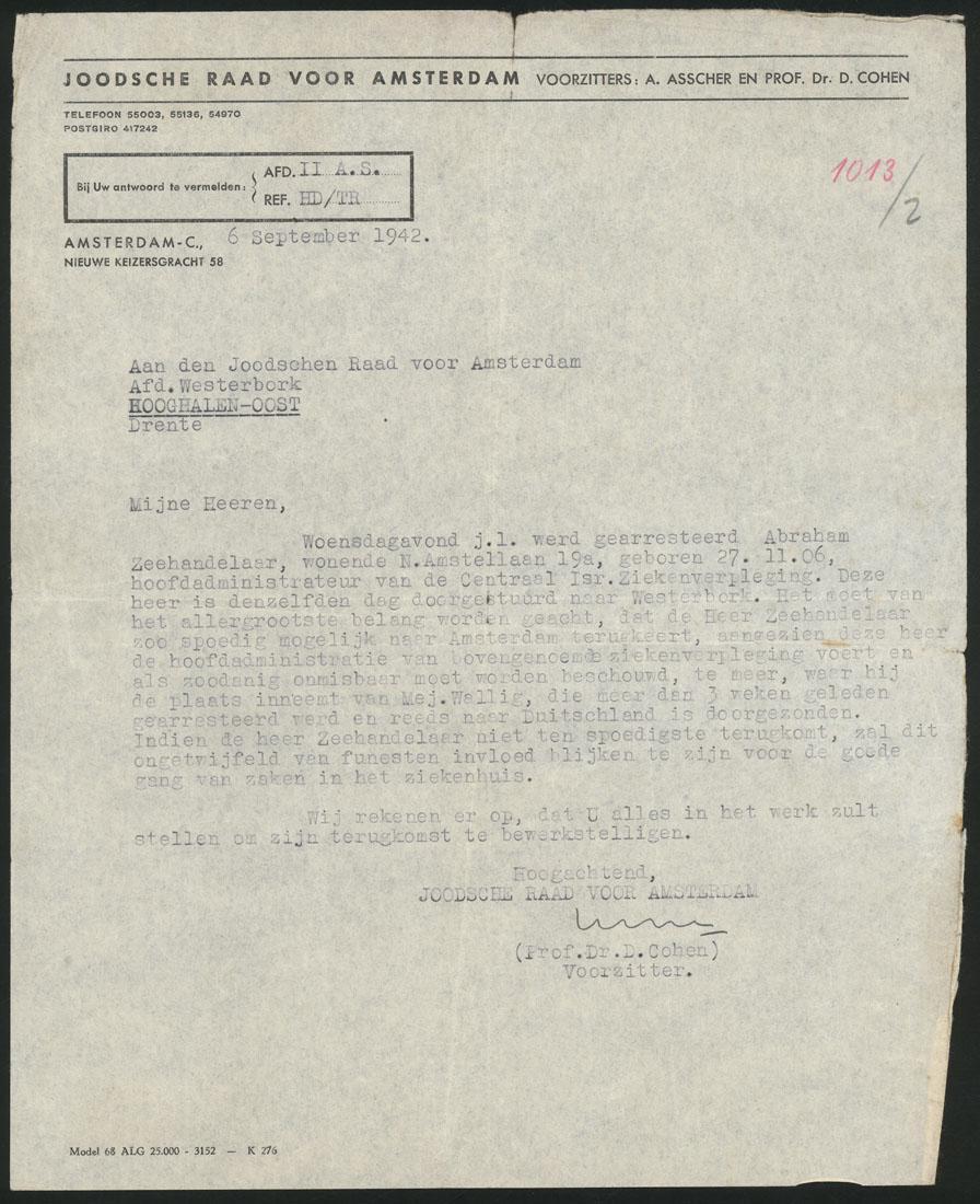 Brief van voorzitter D. Cohen van de Joodsche Raad afd. Amsterdam aan Joodsche Raad afd. Westerbork waarin zij aandringen op het terugsturen van Abraham Zeehandelaar naar Amsterdam, 1942