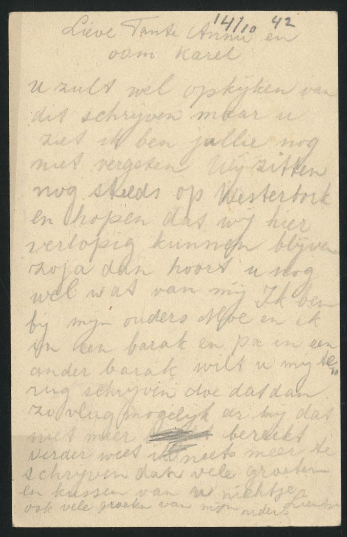 Briefkaart van Celine Gobits-Elzas in Westerbork aan de familie K. Beesemer in Amsterdam, 1942