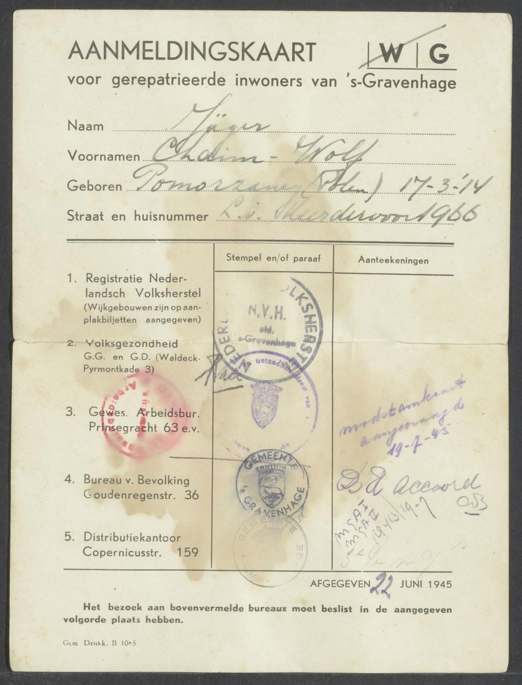 Dossier met oorlogsdocumenten met betrekking tot Chaim Wolf Jäger, zijn verblijf in Westerbork en zijn repatriëring, 1940-1945