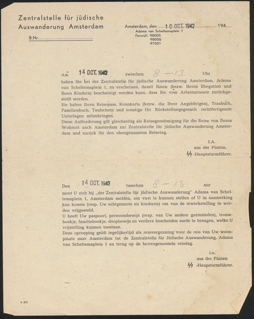 Omvat oproep voor deportatie, correspondentie van de Liquidatie van Verwaltung Sarphatistraaten fotokopie van een typoscript 'Goederen uit voormalige Joodsche zaken' en brief van Centraal Meldpunt Joodse Oorlogsclaim met betrekking tot de arisering van joodse bedrijven.