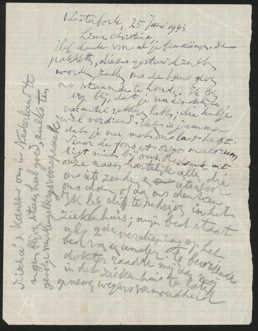 Transcriptie van de brief: "Westerbork, 25 Juni 1943/ Lieve Christine,/ Veel dank voor al je bemoeiingen. De pakketten, die ons gestuurd zullen worden, zullen ons de kans geven ons staande te houden. Ik ben erg blij, dat je nu eindelijk vacantie gekregen hebt; die heb je wel verdiend. Het is jammer dat je nu met ons last hebt. Maar de fons et origo malorum ligt niet bij ons. Bedank uit onze naam hartelijk allen die ons iets zenden en iets voor ons doen of aan ons denken. Ik lig dit te schrijven in het ziekenhuis; mijn bed staat als 2de verdieping op het bed van een ander. Een bevriende dokter raadde mij aan mij in het ziekenhuis te laten opnemen wegens vermoeidheid// en slapte. Ik ben eerst gisterenavond hierin opgenomen en voel mij nu al een heel stuk beter. Het leven en de ligging en de hygiënische en sanitaire toestanden 2) zijn wonderlijk; qui dit Westerbork, dit l’enfer. Het is prachtig dat er op het gymnasium 2 eerste klassen komen. De legitieme rector verheugt zich over dien bloei. Mijn vrouw en Mischa houden zich goed en Etty is incomparable; zonder haar waren we hier verloren. Omtrent Jaap weet ik op het oogenblik niets naders. Ik denk dat Jacobs er wel meer van zal weeten. Hou je flink: ik schrijf hier Ten slotte den ouden priesterzegen uit den pentateuch voor je over: L’Eternel vous bénisse et vous garder! 1) / 2) in de gewone barakken/ 1) L’Eternel fasse luire son visage sur vous et vous donne sa grâce ! L’Eternel tourne sa face vers vous et vous donne sa paix ! Met mijn zeer hartelijke groeten/ L.H." [In de marge van de voorzijde staat nog geschreven] « Mischa’s kansen om in Nederland te mogen blijven staan heel goed, zulks ten gevolge van Mengelbergs voorspraak.”