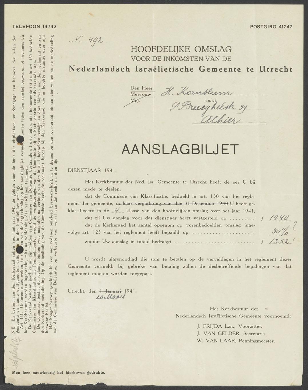 Inleveringsbewijs Rijwielen van Joden ten name van Hermann Kornblum en enige zakelijke brieven aan hem gericht, 1942-1943