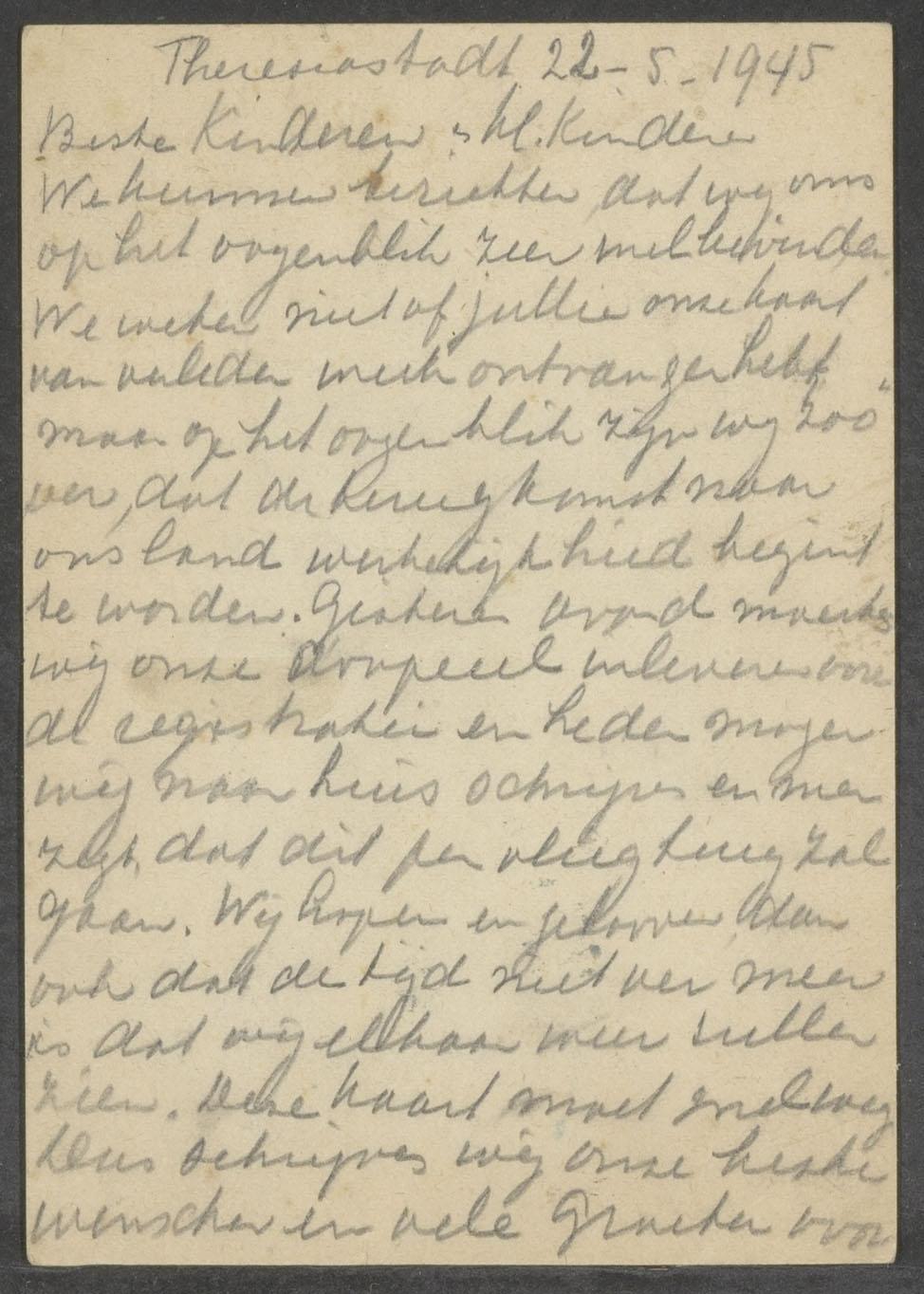 Briefkaart van Hartog Brandon en zijn vrouw Jetje Bonn-Brandon vanuit Theresienstadt aan hun kinderen en kleinkinderen in Nederland, 1945