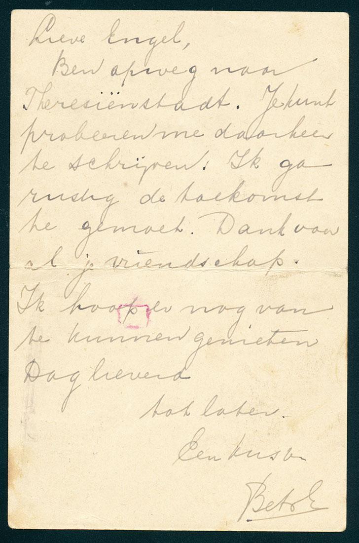 Uit de trein gegooide briefkaart van Elisabeth (Bets) Eisendrath op weg naar Theresienstadt aan Engel Knol in Rotterdam, 1943