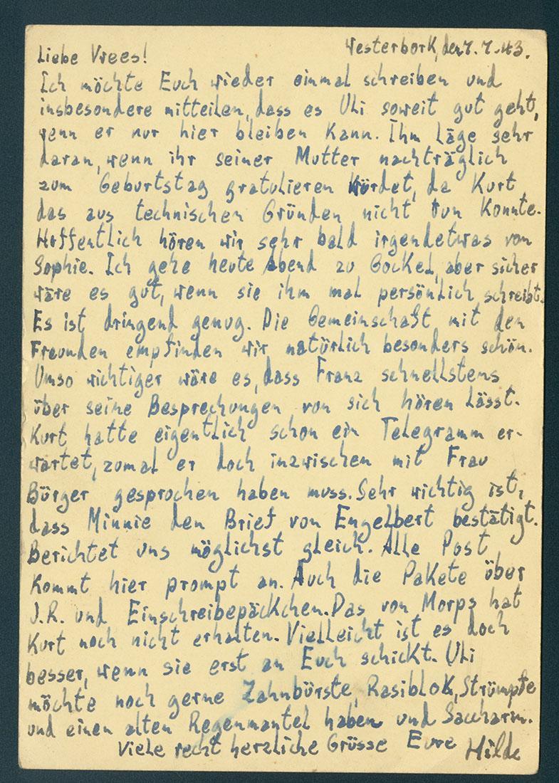 Briefkaart van Hilde Mandel uit Westerbork aan de familie Vree in Utrecht met bericht dat het Uli Beck tot nog toe goed gaat, 1943