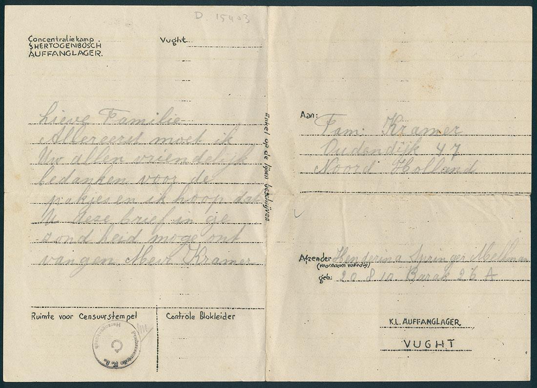 Brief van Henderina Springer-Melkman vanuit kamp Vught aan de familie Kramer in Oudendijk bij Hoorn, juli 1943