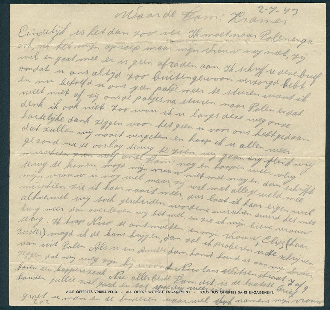 Afscheidsbrief van Max Springer aan familie Kramer, geschreven vlak voor zijn deportatie naar Polen, 2 juli 1943