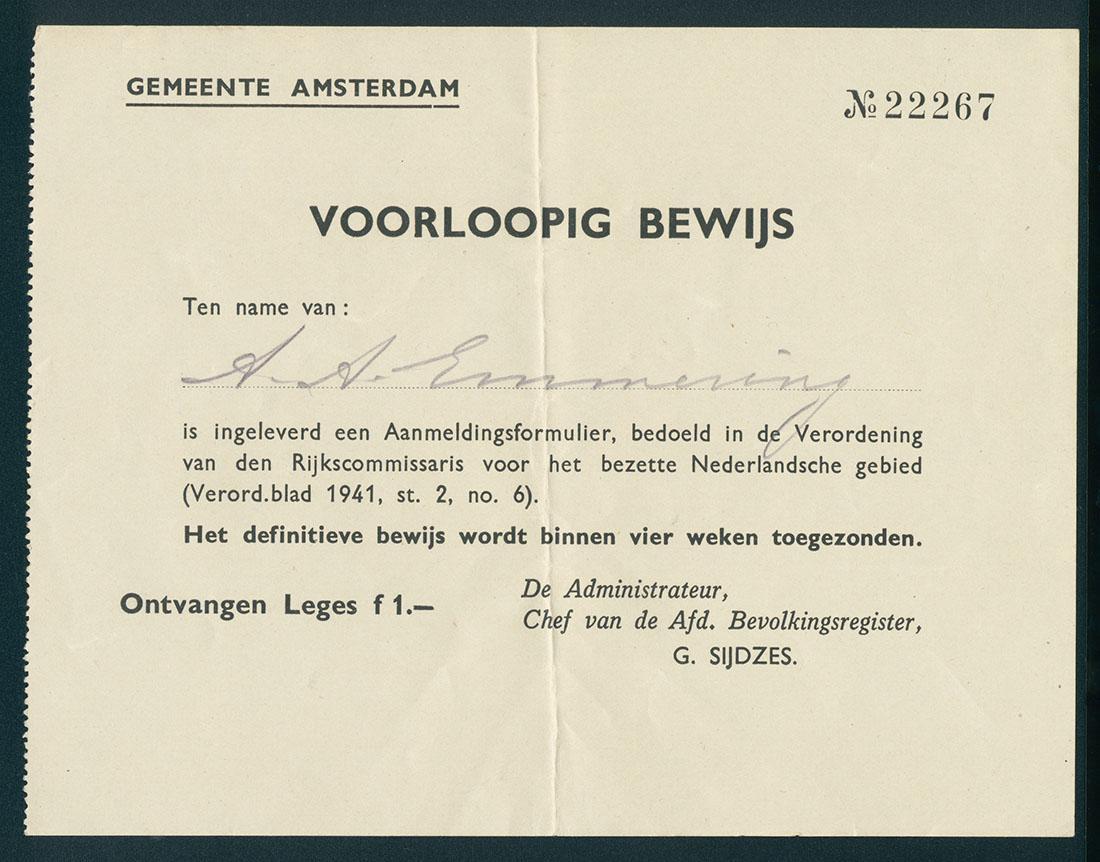 Voorlopig Bewijs van aanmelding als joods persoon ten name van A.A. Emmering, 1941