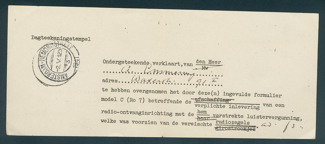 Verklaring ten name van A. Emmering over de inlevering van een radiotoestel, 1941