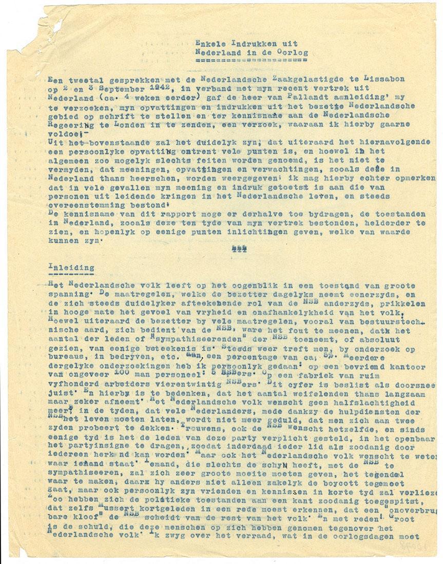 Rapport opgesteld door J.J. Hartog, met opvattingen en indrukken uit het bezette Nederland in de periode1940-1942 t.b.v. de Nederlandse regering in Londen, september 1942