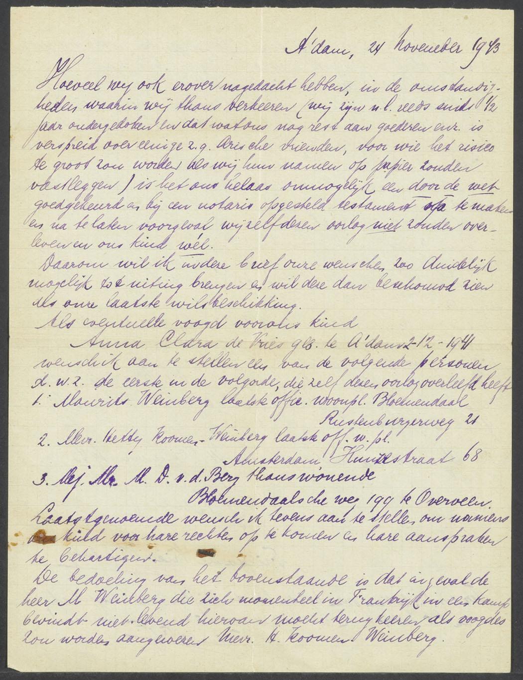 Brief van Henri de Vries en Frieda de Vries-Weinberg vanuit hun onderduik m.b.t. de eventuele voogdij over hun dochtertje Anna Clara de Vries (1941), 1943