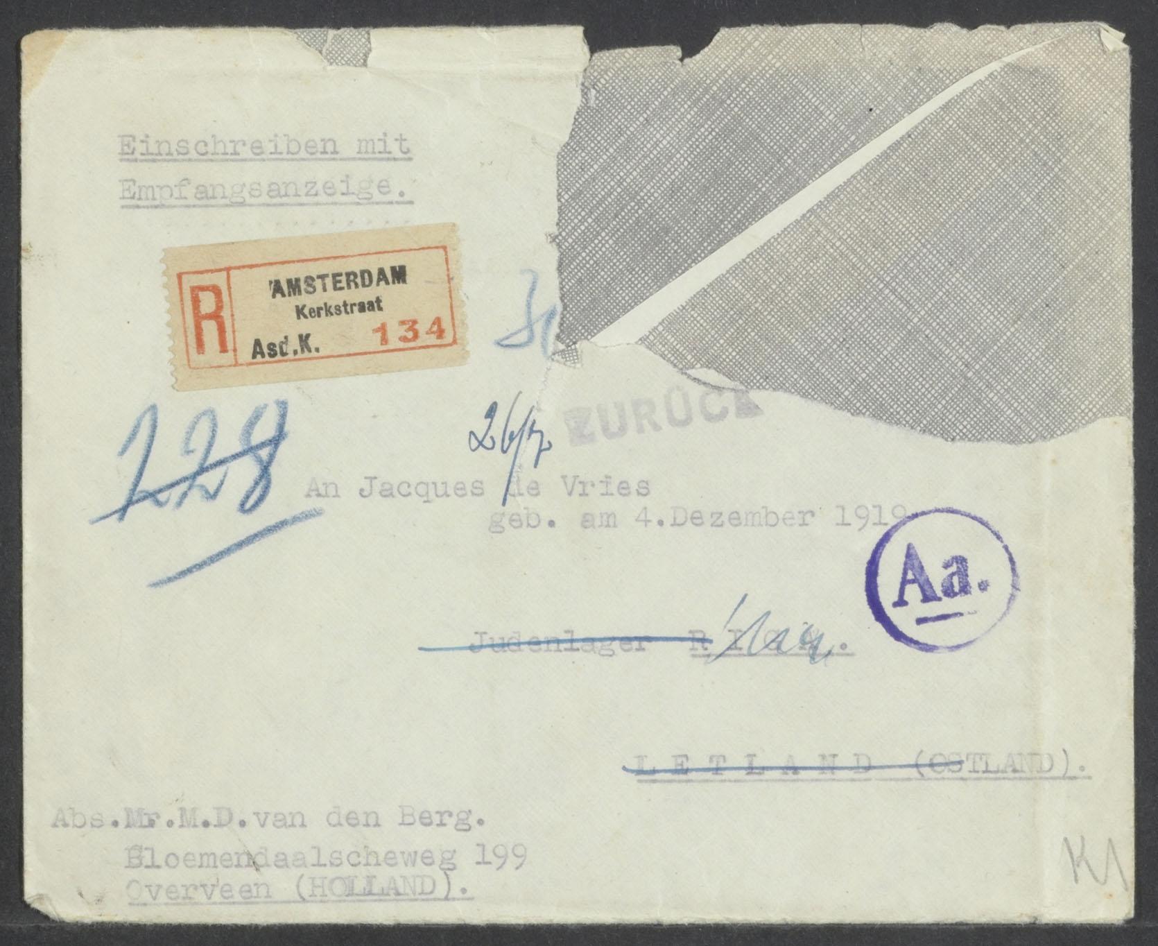 Op het moment van schrijven was Jacques de Vries al meer dan een jaar geleden vermoord in Sobibor. De brief werd als onbestelbaar aan afzender geretourneerd.