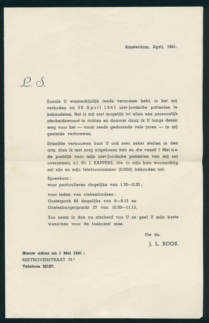 Mededeling en afscheidsbrief van huisarts Jacob Levy Roos aan zijn niet-joodse patiënten dat deze vanaf 1 mei 1941 naar de praktijk van een niet-joodse huisarts gaan, april 1941