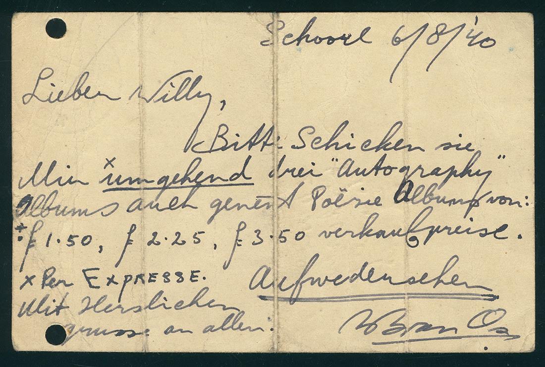 Briefkaart van Wim van Os vanuit interneringskamp Schoorl aan zijn neef Willy Gersteling met verzoek op dagboeokcahiers en poeziealbums op te sturen, 1940