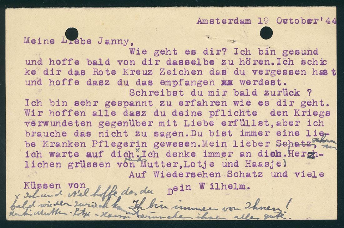 Briefkaart van Wim van Os aan zijn verloofde Marianna Hammel in Theresienstadt, 19-9-1944