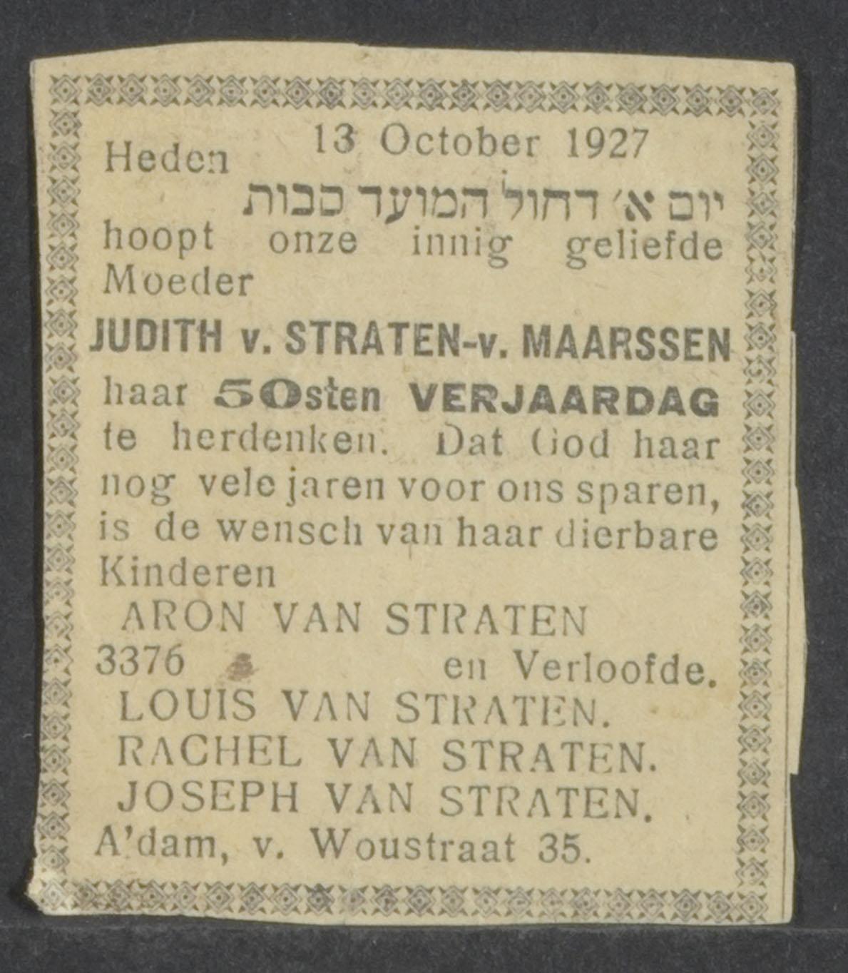 Inhoud o.a.: 1. advertentie uit het Nieuw Israelietisch Weekblad: ... heden 13 oktober 1927... hoopt Judith van Straten-van Maarsen haar 50ste verjaardag te gedenken, ... haar kinderen: Aron van Straten en verloofde, Louis van Straten, Rachel van Straten en Joseph van Straten, van Woustraat 35 2. vermelding van ondertrouw (15 mei 1935) en aankondiging van de huwelijksinzegening van Jo(seph) van Straten en Henny van Dam op zondag 9 juni 1935 in de Synagoge te Groningen 3. krantenartikel: Tweede beschikking van den Commissaris-Generaal voor de Openbare Veiligheid over het optreden van joden in het openbaar en instructie inzake verordening 198/1941 4. oproep Gem. Amsterdam op bevel van de Duitse Weermacht: inlevering van herenrijwielen, 28 juli 1942 5. extra editie van Het Joodsche Weekblad, 14 juli 1942 over de arrestatie van 700 joden en 7 augustus 1942 over Mauthausen 6. krantenknipsel m.b.t. Mauthausen 7. twee duik-kaarten van de L.O. Friesland voor Joseph van Straten en zijn vrouw Henderina Elizabeth van Straten-van Dam. Zij waren ondergedoken bij E. Schreur te Echtenerbrug (Friesland), 20 april 1945 8. enkele krantenknipsels (Provinciale Groninger Courant) van net na de oorlog waarschijnlijk met beschrijvingen van de kampen Auschwitz o.a. door overlevenden 9. gedicht voor "Tante Henny en Oom Jo" op briefpapier van J. Speyer Herman Robbersstraat 110a te Rotterdam, 9 juni 1960. De heer J. Speyer was in 1947 buurjongen van Joseph van Straten te Rotterdam en in dit lied vertelt hij daarover. Hij noemt oom Jo "chef schoenenverkoper in de Bijenkorf". 10. Belgisch rijbewijs van Joseph van Straten, Antwerpen 7 december 1979 11. uitnodiging voor de opening van de nieuwe schoenenzaak van Joseph van Straten aan de Weissenbruchlaan 148 Rotterdam-Hillegersberg op 24 maart (jaar?) 12. bericht dat de nieuwe schoenenzaak vanaf woensdag 25 maart open is 13. boomcertificaat v. Jo van Straten t.g.v. zijn 70ste verjaardag, aangeboden door Flora en Maurits Blitz, 24 december 1981 14. brief van de uitkeringsraad vervolgingsslachtoffers 1940-1945 (+ Stichting 1940-1945) betreffende WUV-mededeling betaling januari 1982 15. uitnodiging voor receptie t.g.v. heropening schoenenwinkel van Straten, Hillegersberg, 10 februari 1982 16. bloedgroepkaart v. h. Ned. Rode Kruis van Joseph van Straten, met adres in Antwerpen (+ foto) 17. kopie van overlijdensadvertentie (onbekend uit welke krant) m.b.t. Joseph van Straten. Hij is overleden op 26 mei 1988 te Antwerpen. Hij was, volgens deze adv. in tweede echt gehuwd met W.G. Eelman.