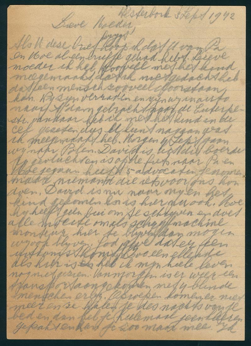 Transcriptie van de brief: Westerbork 3 sept. 1942 Lieve Moeder, Als U deze brief krijgt hoop ik dat u van Pa en Moe al een briefje gehad hebt. Lieve moeder ik heb zoveel met het kind meegemaakt, dat ik niet gedacht heb dat een mensch zooveel doorstaan kan. Wij zijn verraden en zijn wij in auto naar A’dam gebracht naar de Euterpestr. daar heb ik met het kind in een cel gezeten, dus u kunt nagaan wat ik meegemaakt heb. Morgen 4 sept gaan wij naar Polen. David is uit die boerderij gevlucht en is op de fiets naar Pa en Moe gegaan heeft 5 advocaten genomen maar niemand die iets voor ons kon doen. David is nu naar mij en het kind gekomen en is hier nu ook. Moe hij heeft geen bui om te schrijven en doet alle moeite om als schrijfmachine monteur hier te blijven dan mogen wij ook blijven. God geve dat er een uitkomst komt. Zoo een ellende als hier is heb ik mijn heele leven nog niet gezien. Vanmorgen is er weer een transport aangekomen met 4 blinde menschen erbij. Oproepen komen er niet meer en ze halen je des nachts van je bed en dan heb je heelemaal geen kleren gepakt en kan je zoo maar mee. Ik heb geen jurk. Ik heb een blousje en een rok aan. Al onze winterkleren hebben ze uit die boerderij gehaald. D heeft geen winterjas meer alleen ons kind heeft kleeren, dus u kan nagaan hoe wij er aan toe zijn. Tranen om te huilen heb ik niet meer. Ik hoop alleen maar op 1 ding, dat er van God een uitkomst komt. Lieve moeder zorg dat U in ieder geval een rugzak met alles er in klaar hebt staan als er God bewaar wat mocht gebeuren. Ik lig hier met 36 vrouwen op een zaal en wij worden goed gedrild. Dan heeft die een zenuwtoeval en dan weer een ander, het gaat maar de heele dag zoo door. Maar ik wil flink zijn want ik wil jullie allemaal weer terug zien. Een stoel om te zitten bestaat hier niet, eten moet je dus staande, en wat voor eten. Ik ben blij dat Bep bij mij is dan kunnen wij tenminste elkaar troosten. De heele fam. Plotske is hier ook bij mij op de zaal en zijn ze allemaal overspannen, allen zoo uit huis gehaald. Nu lieve moeder ik stop maar terug schrijven kunt U mij niet. Als wij hier mogen blijven wat ik niet geloof dan hoort u vlug genoeg van ons en anders duurt het weken voor U weer bericht krijgt. Maakt u zich niet ongerust, want de wil is bij ons om terug te komen en zullen wij verder op God vertrouwen. Nu lieve moeder houdt U flink en doet U nu wat ik U gezegd heb aangaande die rugzak. Heel veel hartelijke groeten en zoenen van David en Kareltje en in het bijzonder van mij Uw liefhebbende Jo.
