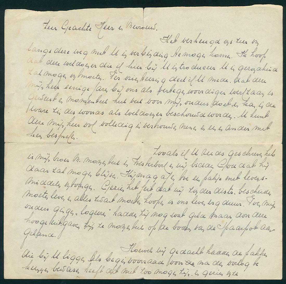 Brief van Abraham de Leeuw waarmee hij vanuit zijn onderduik iemand bij een echtpaar introduceert, ca. 1942-1943