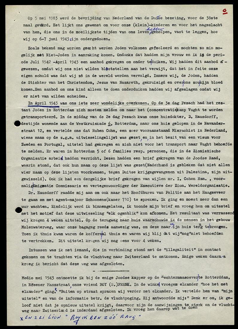 Inhoud o.a.: 1. Aanmeldingsformulier (kopie) Registratiekantoor v.h. Afwikkelings-bureau der Gezamenlijke Plaatselijke Illegale Organisaties (REKA) van Salomon Frenk, 31-05-1945 2. Briefje aan REKA inzake het ontvangen van een Rode Kruis pakket, 01-09-1945 3. Kopie artikel uit krant 14-09-1994 met als titel: "Rode Kruis hielp de bezetter, niet de slachtoffers". 4. Brief (kopie) van Myra Frenk aan tante Esther Reens-van Creveld te New York, geschreven vanuit Maastricht op 29 mei 1945. Zij beschrijft in deze brief hoe haar leven is verlopen na haar vijftiende jaar. Eind 1940 volgde ze de opleiding tot verpleegster in het Joodse Ziekenhuis aan de Schietbaanlaan te Rotterdam. In januari 1943 werd haar moeder, Sophia Frenk-van Creveld, ernstig ziek en na een razzia op transport gesteld. Ze werd na een dag vrijgelaten, maar stierf vervolgens in maart van hetzelfde jaar. In september 1943 zijn Myra, haar vader Nathan, haar broer Salomon met zijn vrouw Lotte Frenk naar Westerbork gestuurd. Door de functie van Salomon (secretaris van de consul van Uruguay) kregen ze een deel van een huisje om in te wonen. Myra werkte er als verpleegster. Op 15 september 1944 is de familie Frenk gedeporteerd naar Bergen-Belsen, waar vader Nathan Frenk in februari 1945 is overleden. Uiteindelijk werden Salomon, Lotte en Myra alle drie ziek. Op 7 april werden zij op transport gesteld, maar deze trein werd op 13 april 1945 bij Farsleben door de Amerikanen bevrijd. Vervolgens kwamen zij in het DP centrum Hillersleben waar zij enkele weken bleven. Vandaar ging het per veewagons naar Maastricht. In de brief noemt zij verschillende namen van familieleden en bekenden, die zijn omgekomen of waarvan zij niet weet wat hun lot is. 5. Brief (kopie) van Salomon en Liselotte Frenk aan Rudi en Lonnie Fried te Westerbork, geschreven vanuit Maastricht op 22 mei 1945. Zij beschrijven hun transport naar Westerbork, naar Bergen-Belsen en vandaar de deportatie met als doel Theresienstadt. Maar deze trein werd door de Amerikanen op 13 april 1945 bij Farsleben bevrijd. Ook in deze brief veel namen. Salomon schrijft, dat hij in Bergen-Belsen zijn vader, Nathan Salomon Frenk, heeft zien sterven. 6. Brieven (kopieën) van Salomon Frenk en Fryderick (Fritz) Zentai uit Zagreb. Zij kennen elkaar uit het DP camp Hillersleben, januari/februari 1946. 7. Betalingsbewijzen uitkering aan nazi-slachtoffers door het CADSU, 1964/65 8. Verslag van onderduiktijd in Rotterdam en Vlaardingen, geschreven door Lion van Dijk en zijn vrouw B.A. van Dijk-van der Heijden, Jeruzalem 15 december 1983. Ook met hulp van Salomon Frenk kon dit echtpaar met hun zoontje Jehoeda vanaf 7 juni 1943 onderduiken bij het gezin M. Ruigrok in Vlaardingen. Ook het gezin van dr. Hausdorff werd in augustus 1943 bij de familie Ruigrok opgenomen. Allen hebben overleefd. Het echtpaar Ruigrok werd op 9 september 1975 door Yad Vashem erkend als Rechtvaardigen onder de Volkeren. In dit verslag wordt ook de naam van Ruben Cohn genoemd.