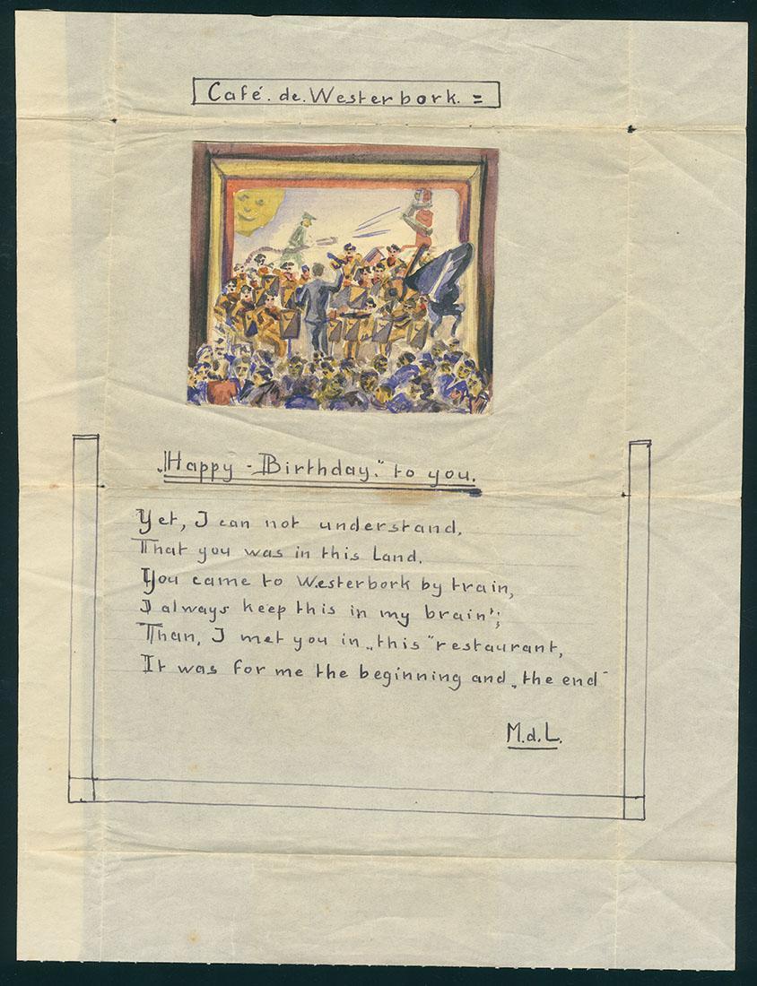 Manuscript in het Engels geschreven in Westerbork met verjaardagswens van Max de Leeuw voor zijn meisje Sera van Esso, 1943