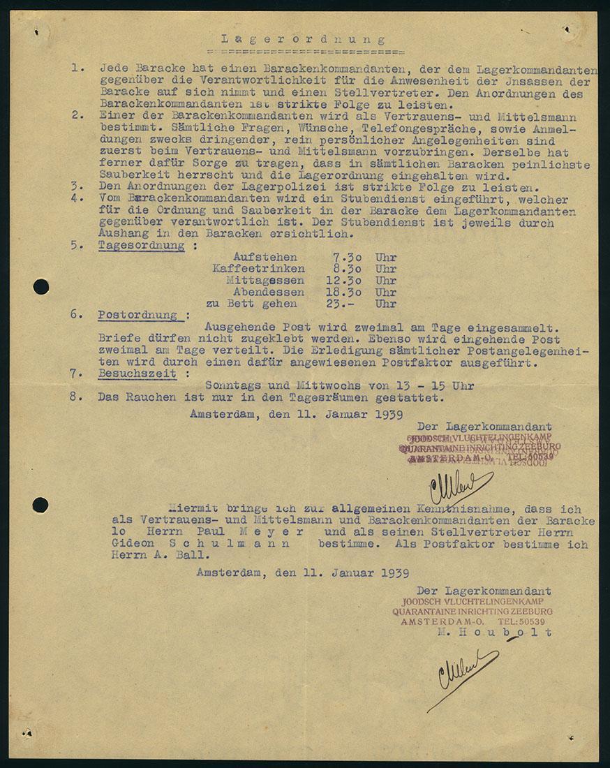 Inhoud o.a.: 1. Kampverordening ('Lagerordnung') nr. 2 van 11 januari 1939 (6x) - regels die het leven in de barakken ordenen. Elke barak heeft een commandant en een vervanger; er is kamppolitie, in iedere barak hangt een dagindeling en een schema voor schoonmaak, er zijn regels voor de post. Op alle zes kopieën van deze kampverordening zijn correcties of notities aangebracht. 2. Documenten m.b.t. barak 10: barakcommandant is Paul Mayer (ook Meyer geschreven), zijn vervanger: Gideon Schulmann, keukenchef: Walter Schockner, kameroudsten: Paul Jonas, Leonh. Littich, Carl Katz, Israel Zehmann, Herbert Voss, Dr. Moral. Lijst met namen (63) van bewoners van barak 10 en werkindeling van 20-26 februari 1939. 3. Regels voor de 'vrijwillige brandweer' voor barak 7 en barak 10 4. Indeling voor onderwijs - 7 maart 1939 5. Kampverordening 2 (31 maart 1939) en 3 (3 april 1939) met het oog op Pesach 6. Regels voor kantine en café (2 mei 1939). Kantinecommissie: dr. L. Hecht, dr. F. Jonas, M. Jacoby, A. Markus en H. Jacobsberg 7. Kampverordening III m.b.t. Kinderen (20 juli 1939) 8. Tekst en vertaling (Duits) van Zecharja 8: 1-13 en van Psalm 74