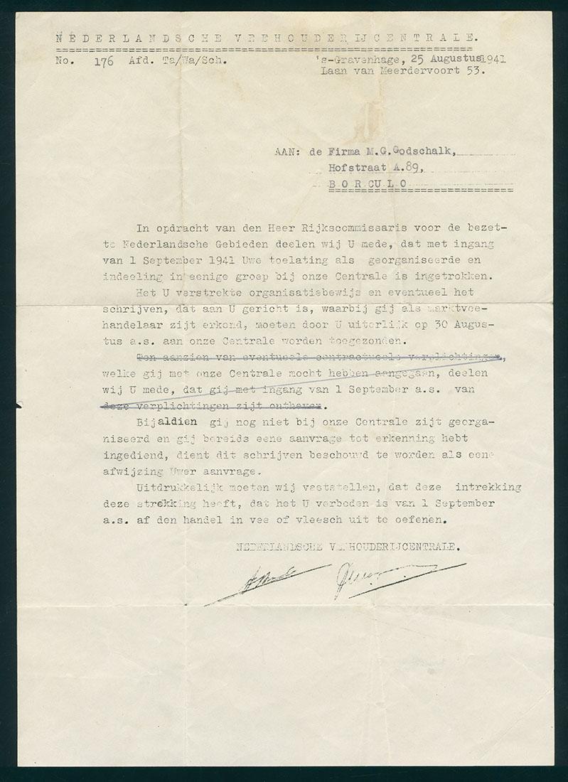 Circulaire van de Nederlandsche Veehouderij Centrale aan de firma M.G. Godschalk dat zijn toelating op last van de bezetter is ingetrokken, 1941