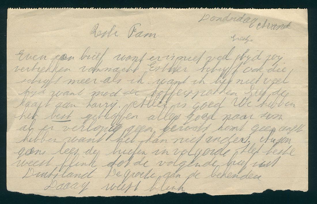 Brief van Greetje en Esther Schellevis aan hun ouders in de Retiefstraat waarin zij afscheid nemen voor deportatie, 1942