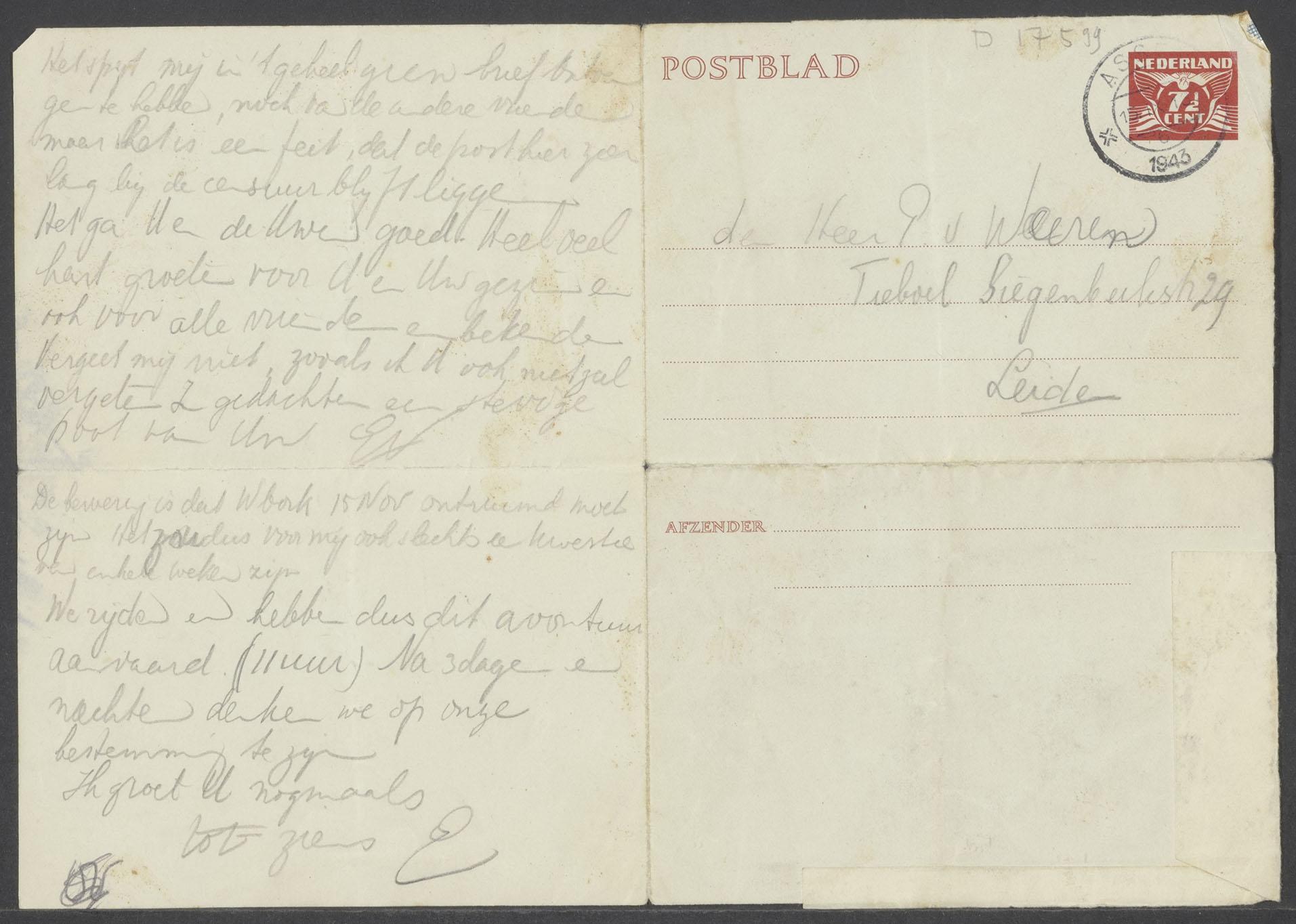Brief van Simon Erich Vles vanuit Westerbork aan de heer P. van Weeren in Leiden, 1943