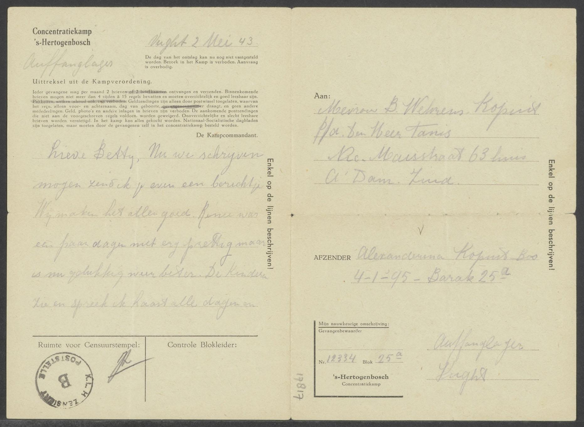 Brieven (4) vanuit concentratiekamp Vught van Samuel Kopuit en Alexandrina (Suze) Kopuit-Bos aan Betty Wehrens-Kopuit, mei 1943