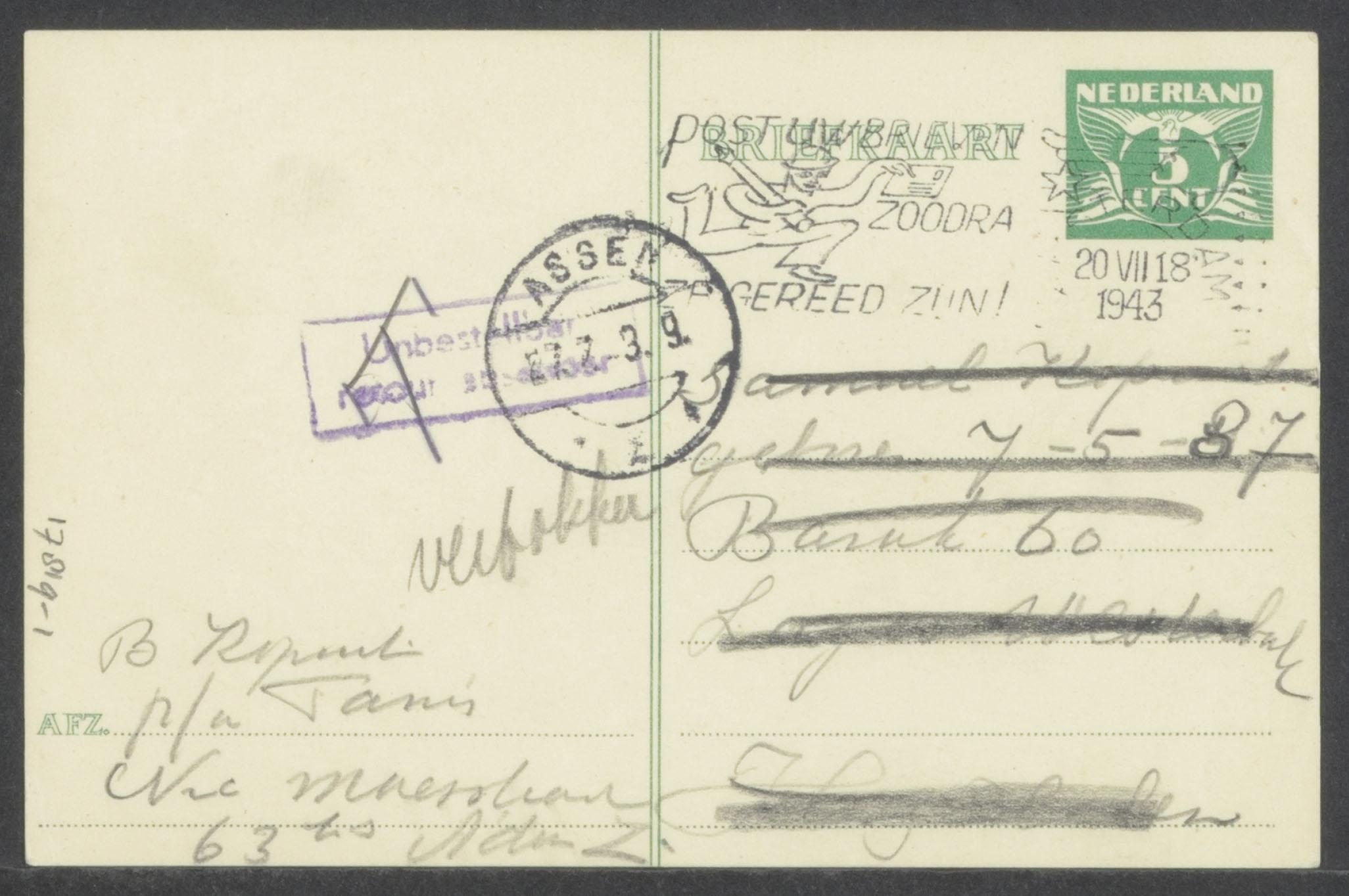 Inhoud: 1. briefkaart van Betje aan haar broer Samuel Kopuit, 20 juli 1943. Ze heeft via de Joodse Raad vier pakketten verstuurd. Het adres is echter doorgestreept: onbestelbaar, retour afzender, vertrokken. 2. briefkaart van tante Betsy aan Jenny Kopuit, 21 juli 1943. Ze hoopt "dat gerucht onjuist is en jullie nog hier zijn...". Het adres is doorgestreept: onbestelbaar, retour afzender 3. enveloppe, afzender: Alexandrina Kopuit-Bos, ziekenbarak 84-B 4. briefkaart aan Alexandrina Kopuit-Bos, 21 juli 1943. Over de gestuurde 4 pakketten. Hetzelfde stempel: onbestelbaar, retour afzender 5. briefkaart aan Renée Kopuit, 21 juli 1943 6. enveloppe, adres van Betje Kopuit, afzender: D. Rosenblatt-de Koning barak 44 E Hooghalen Oost 7. brief van Debora Rosenblatt-de Koning aan tante Betsy, 3 augustus 1943 8. enveloppe, adres van Betje Kopuit, afzender: D. Rosenblatt-de Koning barak 44 E Hooghalen Oost 9. brief van Debora Rosenblatt-de Koning aan tante Betsy, 31 augustus 1943. Dank voor het pakje. 10. briefkaart van Debora Rosenblatt-de Koning aan B. Kopuit, afgestempeld 31 augustus 1943: "Pakket ontvangen, hartelijk dank".