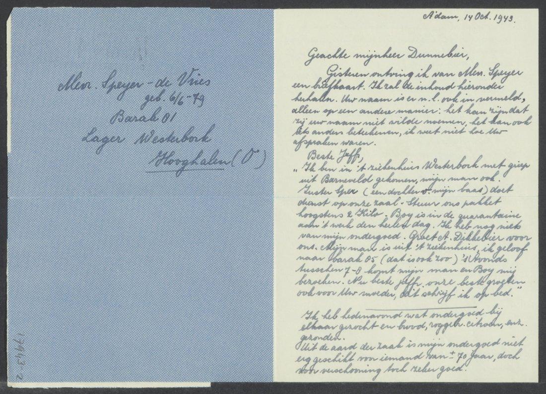 Inhoud: 1. postblad geadresseerd aan dhr. Dunnebier Emantsstraat 21 Den Haag, van Boy (= E.A.M. Speijer?) met de mededeling dat allen naar Westerbork zijn, oktober 1942 2. postblad aan de heer A. Dunnebier van Fr. de Leeuw v. Woustraat 239 met een overgeschreven tekst van een briefkaart van mw. Speijer-de Vries, die schrijft dat zij met griep uit kamp Barneveld naar Westerbork is gekomen, 14 oktober 1943 3. brief van Boy aan juffrouw Burggraaf over pakjes en pakketten; hij uit de wens bijzondere postzegels te ontvangen als verzamelaar, 15 oktober 1943 4. briefkaart v. Fr. de Leeuw aan mw. Speijer-de Vries in barak 81 met felicitaties voor verjaardag, 4-6-1944. Het adres barak 81 was verouderd, men heeft eerst in barak 85 gezocht blijkt uit de aantekening linksboven; uiteindelijk vond men haar in barak 84. Vanaf hier zijn de woorden geschreven op voorgedrukt briefpapier van Lager Westerbork Hooghalen Oost met de originele postzegels erop: 5. aan mej. C. Burggraaf te Den Haag van dr. E.A.M. Speijer barak 85. Hij vraagt om de brieven te laten circuleren onder vrienden en bekenden 6. idem uit barak 72, 25 juli 1944 (met potlood geschreven, moeilijk leesbaar) 7. aan mej. A. Vacikova te Den Haag van P. Heirsch-Vissers uit barak 85 8. aan dr. H.C. Blöte Wilgenlaan 8 Voorschoten van dr. E.A.M. Speijer, barak 85 waarin hij schrijft over wat hij allemaal heeft gevonden op zijn vakgebied insecten-en plantkunde 9. aan de dames Bertou te Den Haag, van mw. Speijer-de Vries uit barak 84, waarin ze schrijft over levensmiddelen die ze mogen ontvangen, dat het er eentonig is en dat ze niet naar de revue gaan onder deze omstandigheden, 23 maart 1944 10. aan mej. N. van Brussel Perponcherstraat 103 te Den Haag van mw. E. Speijer-de Vries, barak 84, waarin ze schrijft dat de Postsperre is opgeheven en dat ze met haar man is verhuisd naar barak 84, het Altersheim. Het is Poeriem, 10 maart 1944 11. aan mej. C. Burggraaf te Den Haag van mw. E. Speijer-de Vries, over de vele verhuizingen, de ontvangst van pakjes en de vraag om naalden om kousen te stoppen, 15 juni 1944 12. aan mej. C. Burggraaf te Den Haag, afzender is mw. B. Boassson-Heirsch, de geschreven tekst is echter van Boy (E.A.M. Speijer) 13. aan mej. C. Burggraaf van Mozes Speijer barak 84 waarin hij o.a. schrijft over het weer en dat wanneer het hard waait je buiten een stofbril nodig hebt, 4 mei 1944 14. aan dames Bertou te Den Haag van dr. E.A.M. Speijer barak 72, de gezondheidstoestand is goed, maar het weer slecht. Van de pakjes die ze ontvingen, was een een beetje gehavend..., 20 juni 1944 15. aan dr. H.C. Blöte te Voorschoten, afzender: B. Boasson-Heirsch, barak 85, de geschreven tekst is echter van dr. E. Speijer; hij schrijft over welke interessante vondsten hij heeft gedaan en vraagt ook om bepaalde zaken op te sturen, 10 mei 1944 16. aan mej. C. Burggraaf te Den Haag van M. Speijer, barak 84. Hij vraagt hoe het met de buren gaat en "Jullie kunnen je niet voorstellen, hoe wij naar berichten van jullie verlangen...". Hij schrijft ook over mw. de Groot-Haas uit Den Haag, die de zieken in haar barak verzorgt en over Carel Hedeman, die al 17 maanden in Westerbork is, 26 april 1944 17. aan de dames Bertou Ieplaan 80 Den Haag van mw. E. Speijer-de Vries, barak 84, zij schrijft dat de pakjes geregeld overkomen en zij er veel plezier van hebben, 29 juni 1944 18. aan de dames Bertou te Den Haag van mw. E. Speijer-de Vries, barak 84, in deze barak wonen de mensen van gevorderde leeftijd. Ze mogen brieven en pakjes ontvangen, alleen met pakketzegel. Groeten aan buren, 26 februari 1944 19. aan mej. C. Burggraaf te Den Haag, afzender: Dr. Emanuel A.M. Speijer, barak 85; hij heeft bronchitis, "gevolg van een plotselinge verandering van werkkring voor velen van ons..". Hij vindt het jammer dat hij daardoor nauwelijks aan verzamelen voor het museum toekomt. 24 maart 1944 20. aan de dames Bertou te Den Haag van mw. E. Speijer-de Vries, barak 84, ze bedankt de fam. Emanuel voor de japon o.a., 18 april 1944 21. aan de dames Bertou te Den Haag van mw. E. Speijer-de Vries, barak 84, Boy werkt weer op het laboratorium, maar voelt zich nog slap, 21 april 1944 22. een leeg, onbeschreven vel briefpapier