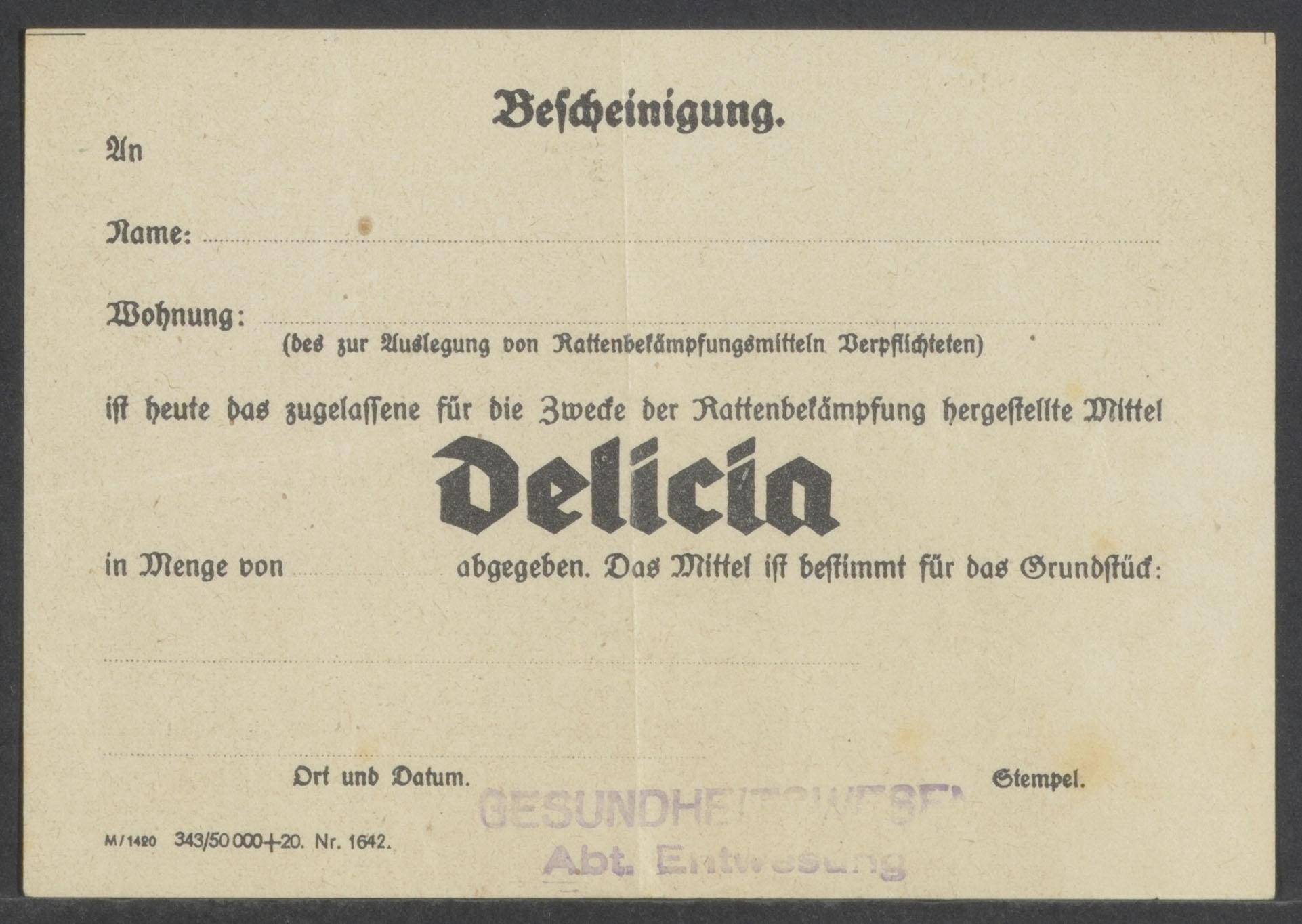 Inhoud: 1. bewijsbriefje dat aan een bepaald persoon in een woning in het getto Theresienstadt het middel Delicia is afgegeven, dat bestemd is voor de rattenbestrijding, Afdeling Ontdoen van Ongedierte van het Gezondheidswezen 2. idem met op achterkant aantekening met potlood 3. formulier van Afdeling WAP W3293, waarin aan de Arbeidscentrale om toewijzing van arbeiders wordt gevraagd voor een bepaalde dag voor het inkt vullen, 2 december 1944 4. idem, 4 december 1944 5. legitimatiepasje voor dr. Emanuel Arnold Maurice Speijer van het Gezondheidswezen waarin staat vermeld, dat het hem is toegestaan, tijdens de uitoefening van zijn werk, alle instellingen van het Gezondheidswezen binnen te gaan; ondertekend door docent dr. Richard Stein, 2 mei 1945 (zie ook achterkant van het 'pasje') 6. formuliertje getiteld: Jüdische Selbstverwaltung Theresienstadt - Gesundheitswesen und Fürsorge; het betreft een soort diagnoseformuliertje van de geneeskundige onderzoeksdienst, niet ingevuld, wel naam op achterkant met potlood geschreven 7. idem, met achter op in rood allerlei opmerkingen 8. formuliertje betreffende ziekten van dr. Emanuel Speijer 9. korte tekst op afleveringsbewijs van de Economische Afdeling (Wirtschaftsabteilung) met de vraag om elkaar te ontmoeten voor de Magdeburger Kazerne, op de achterkant staat het adres: dr. Em. Speijer 10. Formuliertje van de Economische Afdeling inzake brandstof, 24 mei 1945 (zie ook achterkant) 11. formuliertje betreft een oproep om een kostuum te passen in de Südbarakken 12. briefje met medische aantekeningen van dr. Emanuel Speijer 13. klein briefje met de naam van dr. Emanuel Arnold Maurice Speijer en enkele cijfers en letters 14. idem