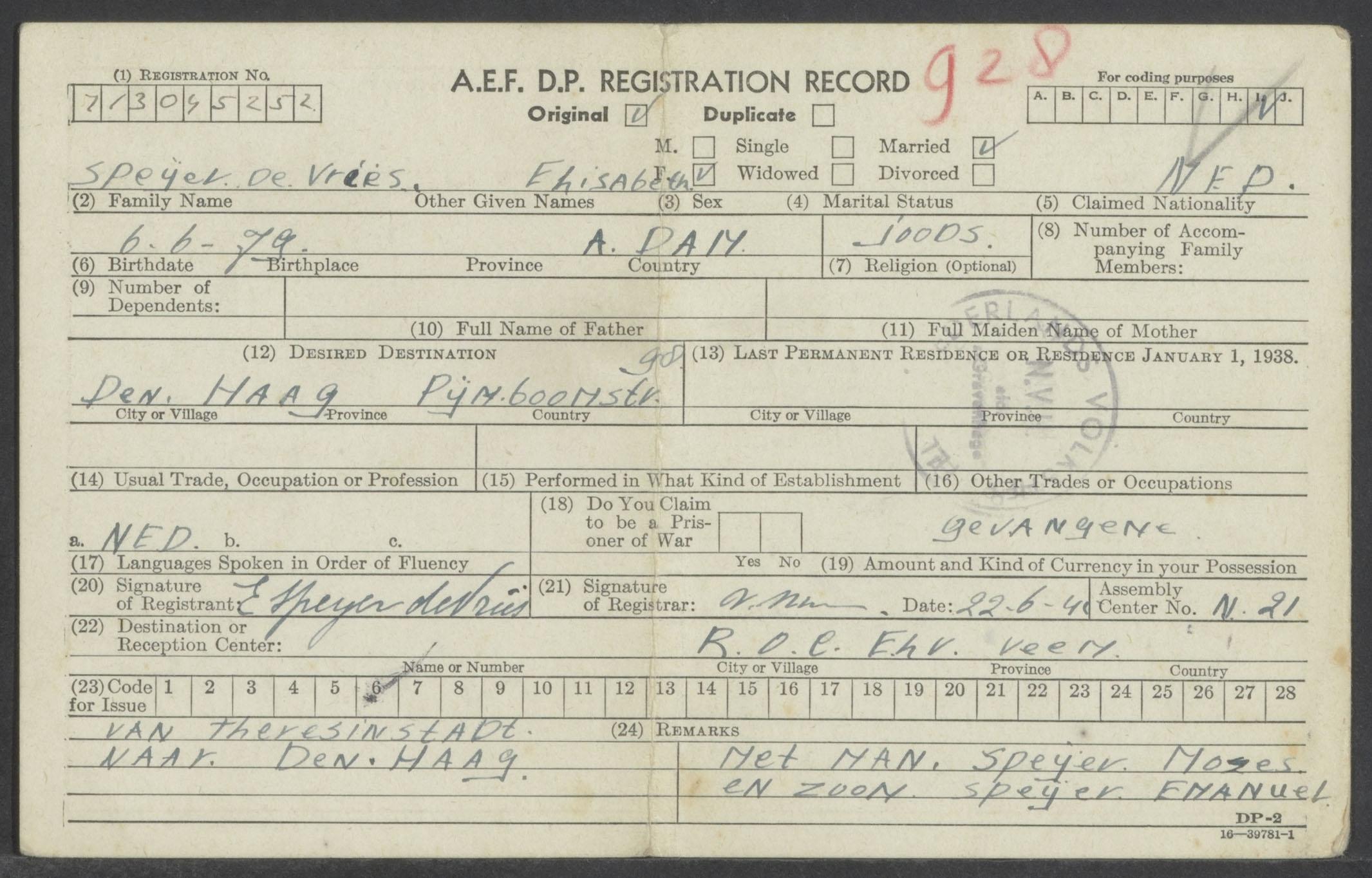 Registratieformulier van de A.E.F. D.P. voor repatrianten op naam van Elisabeth Speijer-de Vries, 22 juni 1945