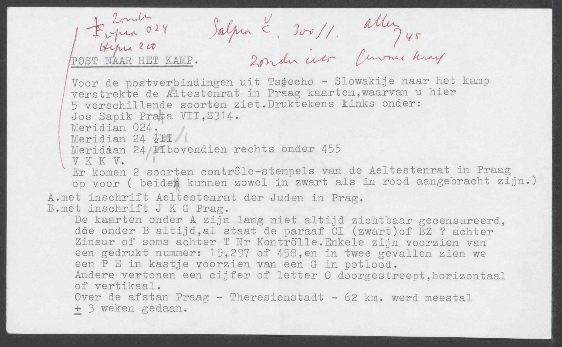 Achtentwintig kaarten hebben diverse namen en adressen als afzender, maar uit de geschreven tekst achter op de kaarten blijkt dat het door een en dezelfde persoon is geschreven. Zie voor uitleg van stempels en nummers het artikel van dr. E. Speijer in genoemd tijdschrift + bijgevoegd getypte uitleg. De andere drie hebben onduidelijke afzenders, wel met gedrukte postzegel van A. Hitler.