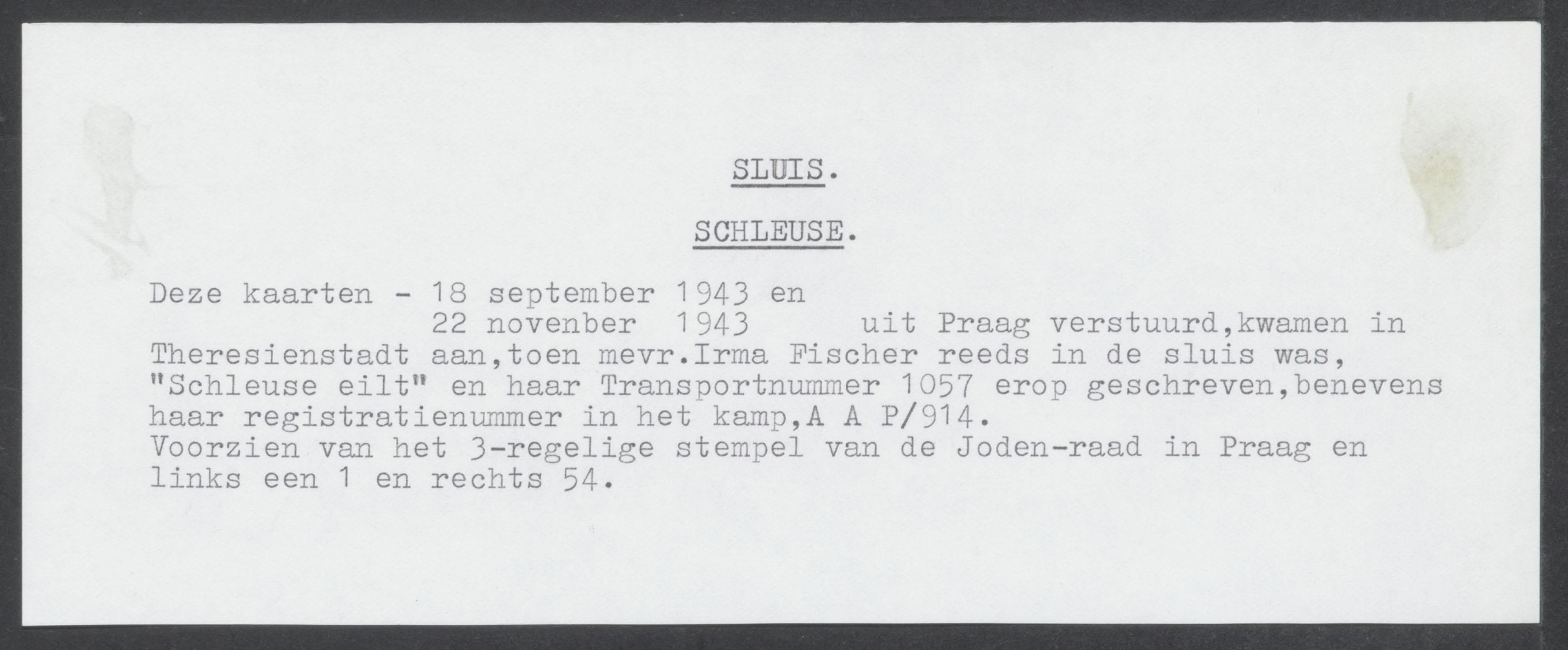 Dr. E. Speijer schrijft als uitleg: Deze kaarten van 18 september en 22 november 1943 uit Praag verstuurd, kwamen in Theresienstadt aan, toen mevr. Irma Fischer reeds in de sluis was, "Schleuse eilt" en haar Transportnummer 1057 erop geschreven, benevens haar registratienummer in het kamp AAP/914. Voorzien van het 3-regelige stempel van de Joodse Raad Praag en links een 1 en rechts 54.