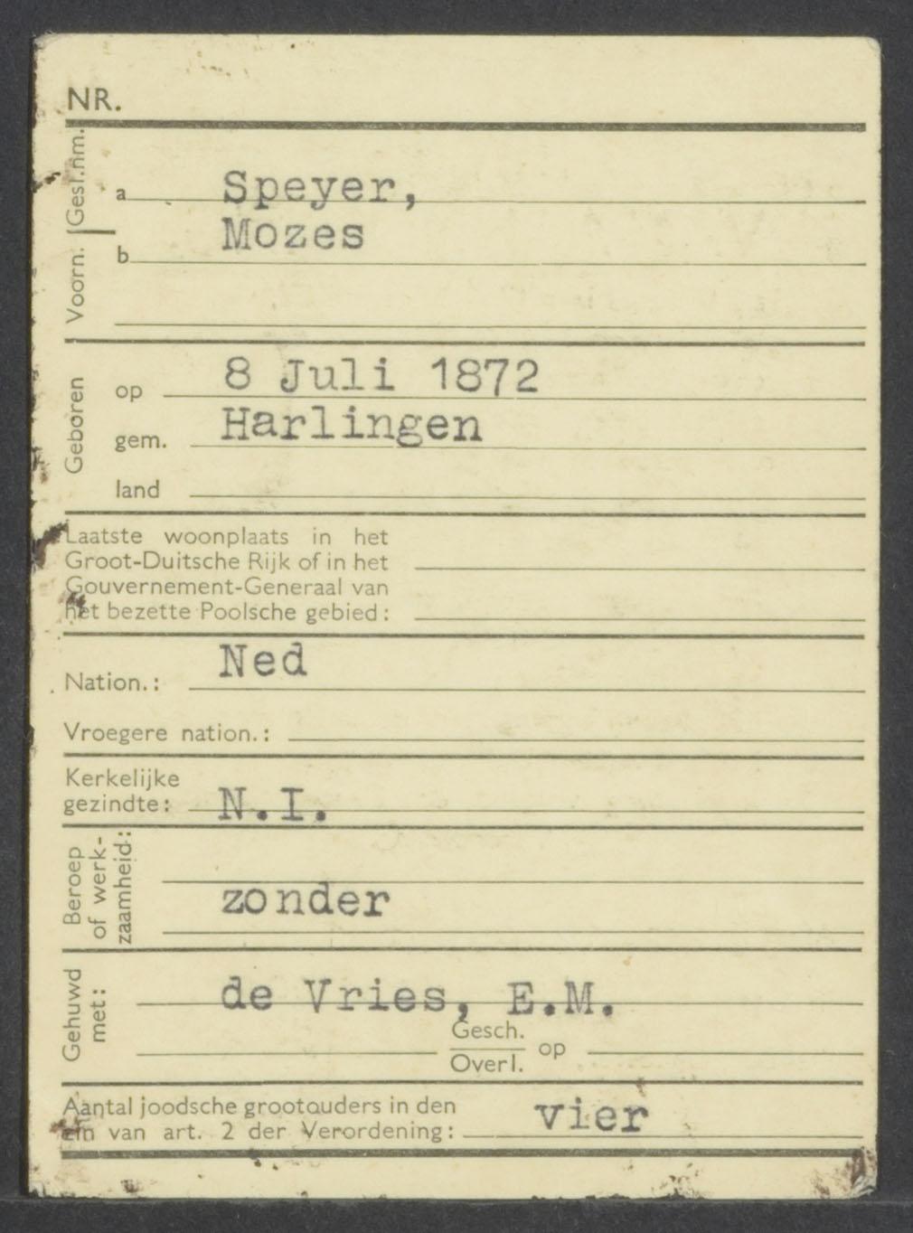 Aanmeldingsbewijs voor 'personen van geheel of gedeeltelijk joodschen bloede', op naam van Mozes Speijer, 1941, uit de verzameling poststukken van dr. E.Speijer