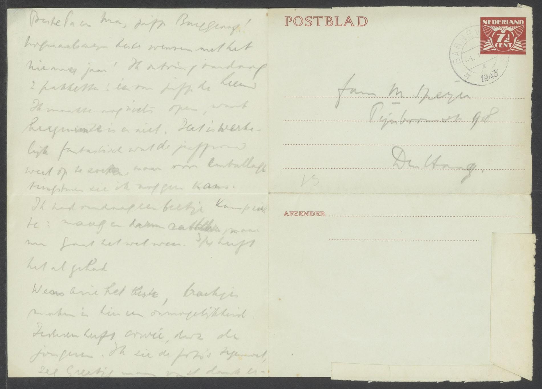 Inhoud: - postblad gericht aan zijn ouders en mej. Burggraaf Pijnboomstraat 98 Den Haag, afzender Boy (=E. Speijer). Nieuwjaarswensen en vermelding van ontvangst twee pakketten. - postblad van zijn ouders, zij verwachten op 13 januari te Barneveld aan te komen, alles is in kisten ingepakt, 4 januari 1943 - postblad van zijn ouders: "t Is verschrikkelijk hoe Den Haag er uitziet. Je zult het niet meer kennen als je terug bent. Evenmin als on huis. Alles is gepakt, want we rekenden op het vertrek van de 6de. We zijn dus al in de kampstemming...."5 januari 1943 - postblad van zijn ouders: "Leon en Arie zijn dinsdag naar Westerbork gebracht. Eindelijk hebben zij rust..", 7 januari 1943 - postblad van zijn ouders: "...Kun jij vanuit B(arneveld) wat doen om onze komst te bespoedigen? Simons zegt, wij moeten geduldig afwachten...", 12 januari 1943 - postblad van zijn ouders: "...Met wie wij zullen omgaan in B(arneveld) kunnen wij hier niet uitmaken..Gosschalk was ook enige malen bij ons. Die komt ook op de Schaffelaar...Er was vandaag weer geen visch. Wij hadden zelfs op Sabbath niets...", 13 januari 1943 - lege enveloppe, afzender: Lippmann, Rosenthal & Co. Sarphatistraat Amsterdam-C, geadresseerd aan Erven E.A. Speyer , adres Pijnboomstraat 98 Den Haag doorgestreept en nieuw adres : Joodsche Tehuis te Barneveld (G.), diverse stempels - postblad aan dr. E. Speijer te Barneveld van Tr. de Leeuw Beethovenstraat 239 Amsterdam; zij heeft een pakje aangetekend verstuurd aan zijn moeder en is bang dat het niet is aangekomen, 13 mei 1943 - postblad aan dr. E. Speijer te Barneveld van Tr. de Leeuw van Woustraat 239 Amsterdam; zij schrijft dat zij tegelijk met deze brief een klein pakje vis zal sturen. Haar moeder heeft voor deze vis zes uur in de rij gestaan, 7 juli 1943