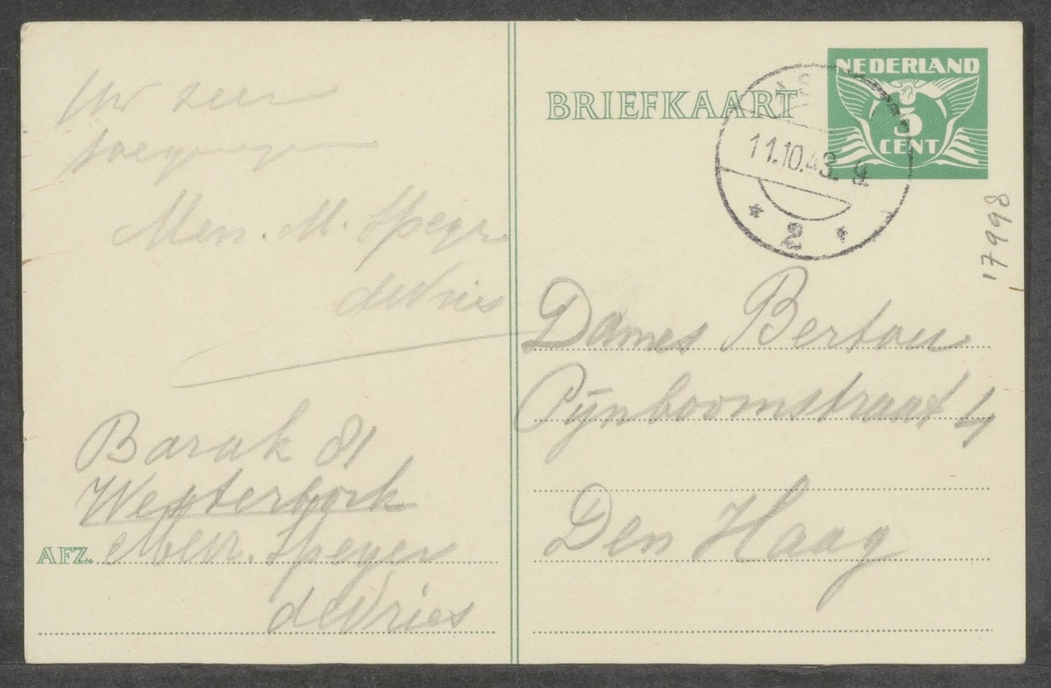Briefkaart van Elisabeth Speijer-de Vries waarin zij de dames Bertou in Den Haag laat weten te zijn aangekomen in Westerbork, 1943, uit de verzameling poststukken van dr. E. Speijer