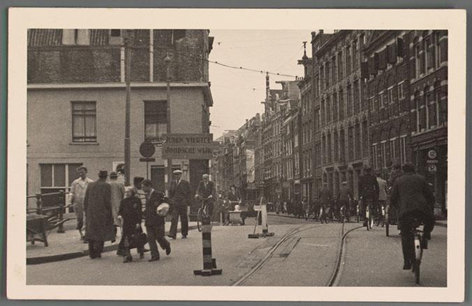Prentbriefkaart van de Jodenbreestraat in Amsterdam met het Rembrandthuis en een bord "Joodsche wijk", circa 1942