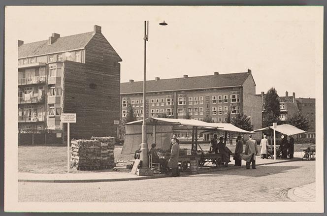 Prentbriefkaart met foto van markt op het Minervaplein die blijkens het bordje links uitsluitend toegankelijk is voor joden, circa 1941
