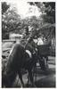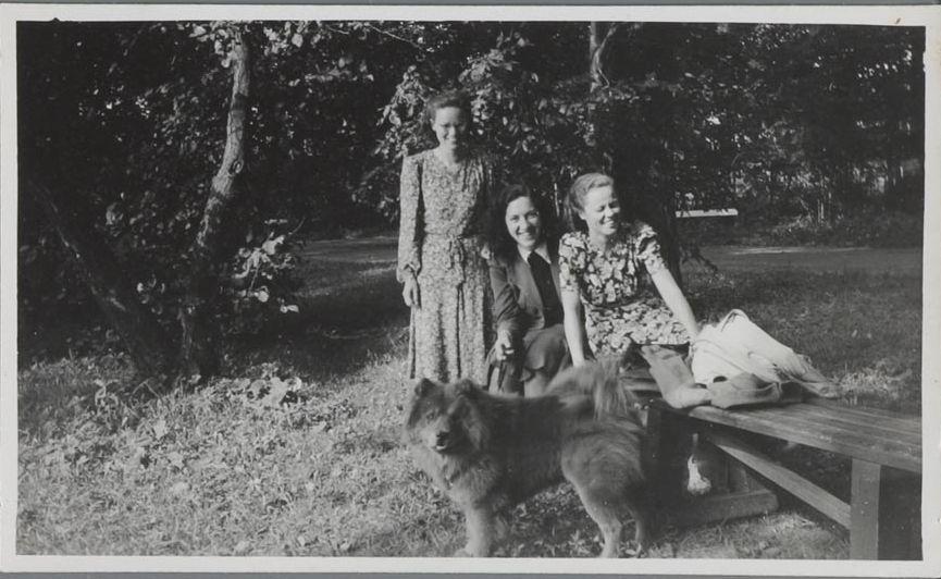 Foto van de gezusters Wilhelmina (Mien) en Gerarda (Ger) Zegers op bezoek bij hun vriendin Vera Turksma met haar chow-chow-hond in Santpoort, circa 1942