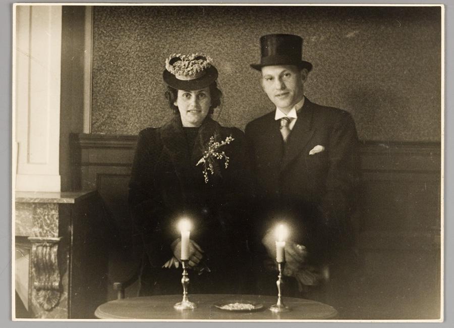 Ephraïm Content en Maria Leever tijdens de huwelijksvoltrekking in de Rapenburgersjoel op 31 maart 1942