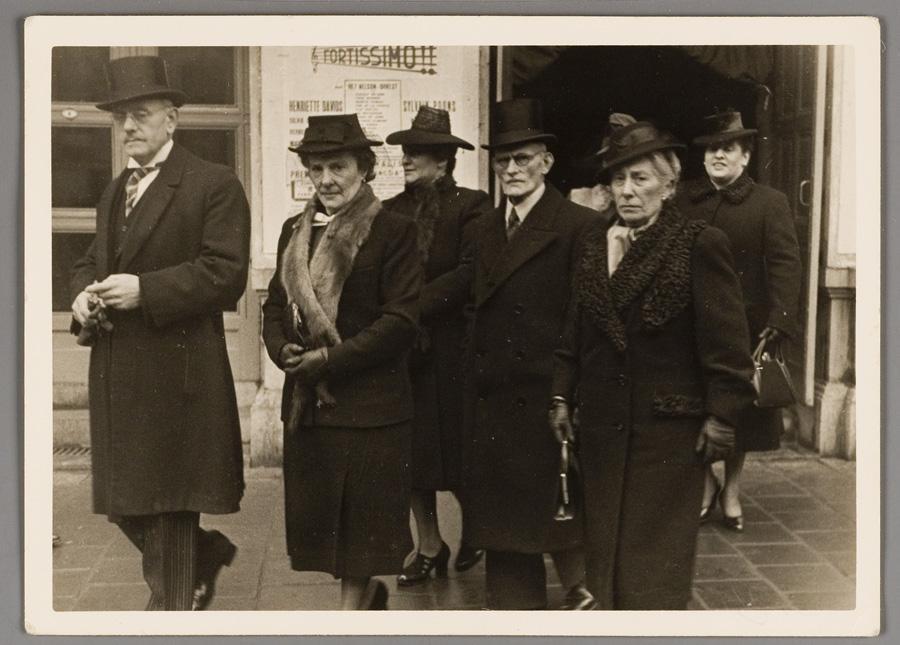 Huwelijksgasten verlaten de Hollandsche Schouwburg na de voltrekking van het burgerlijk huwelijk van Ephraïm Content en Maria Leever op 31 maart 1942