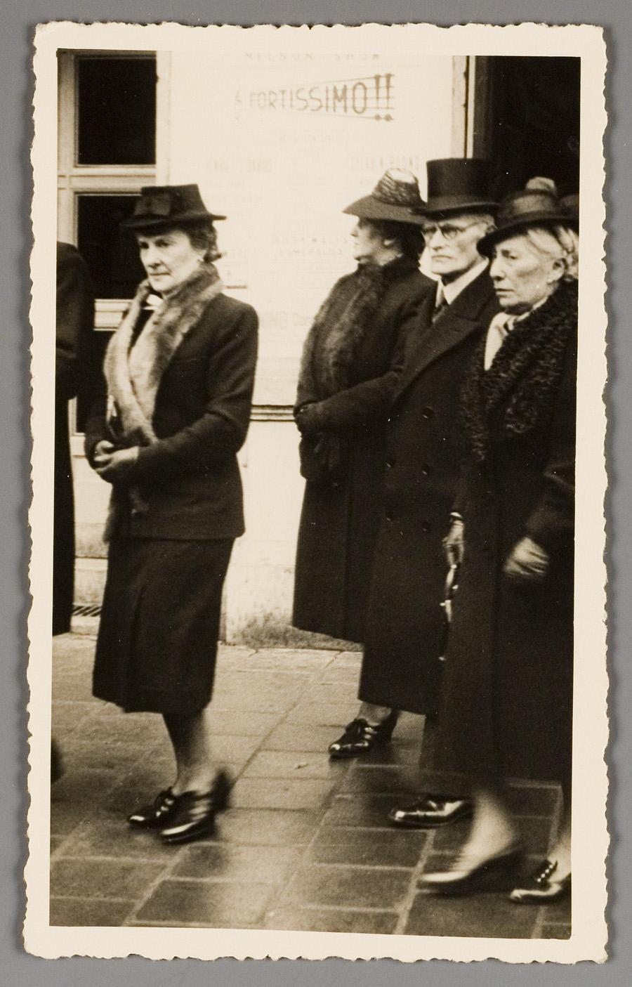 Judith Content-Blanes verlaat de Hollandsche Schouwburg na de voltrekking van het burgerlijk huwelijk van haar zoon Ephraïm Content met Maria Leever op 31 maart 1942