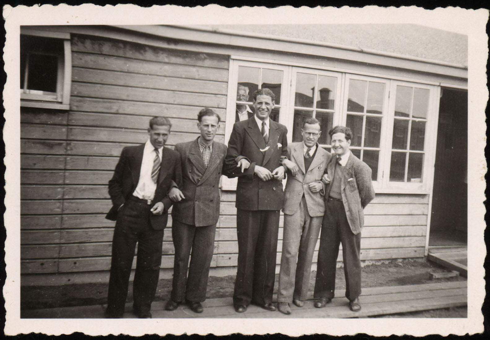 Hijman (Herman) Pais (tweede van links) en vier andere mannen staand voor een barak in het werkkamp Geesbrug, circa 1942