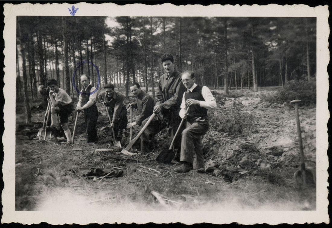 Rehuel (Felix) d'Ancona (1902-1978) met andere gevangenen in het rijkswerkkamp "De Vecht" bij Dalfsen in Overijsel, ca. 1942