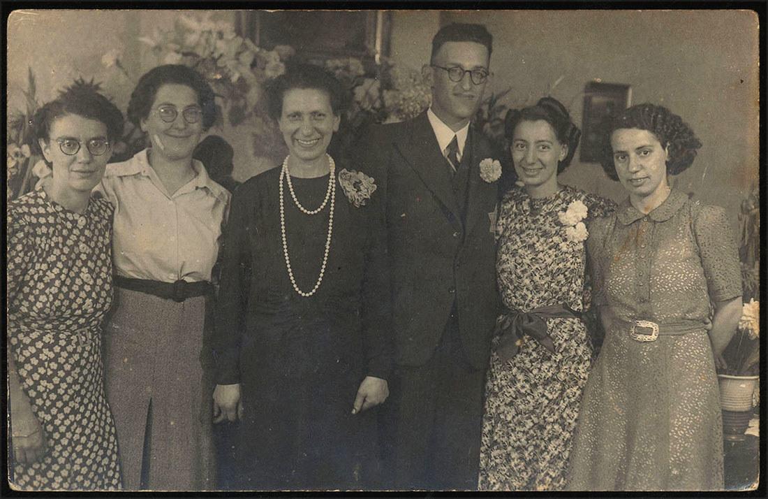 Familiefoto gemaakt ter gelegenheid van het huwelijk van Tilly Verveer en (vermoedelijk) Max van Ments op 6 augustus 1942