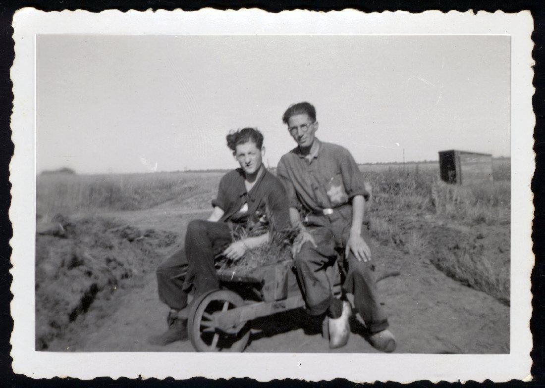 Machiel Zilverberg (links) met een medekampgenoot (met jodenster) op een kruiwagen in Werkkamp Conrad, juli 1942