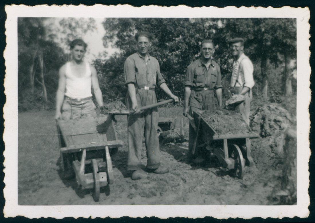 Machiel Zilverberg (links) en drie kampgenoten met kruiwagens in werkkamp Conrad, juli 1942