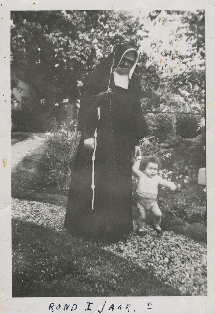Foto van moeder-overste Fructuosa met de kleine Freddy Blog aan de hand, lopend door een tuin, Woerden 1944